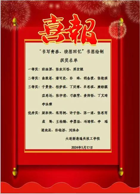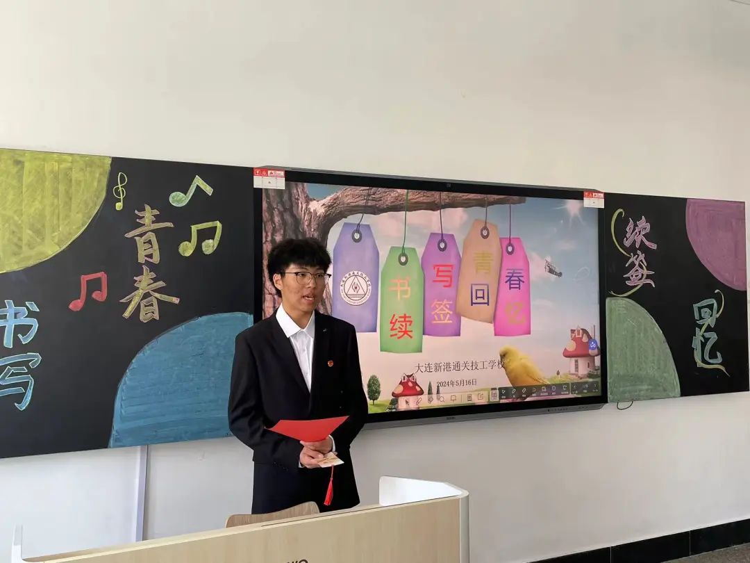 这校园如画的时刻,又迎来了一年毕业季,5月16日,我校举办了“书写青春 续签回忆”书签绘制决赛评选活动。本次活动邀请大连新港通关技工学校校长解建国、学院保卫处处长孙成军、副校长范大振、教学副主任裴莉琳、基础教研室教师和教官参加。