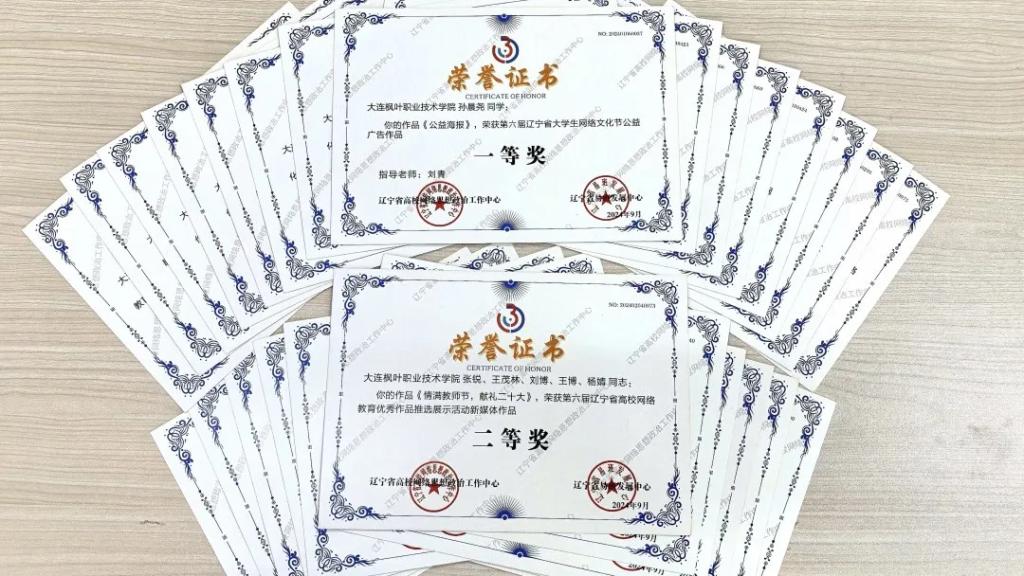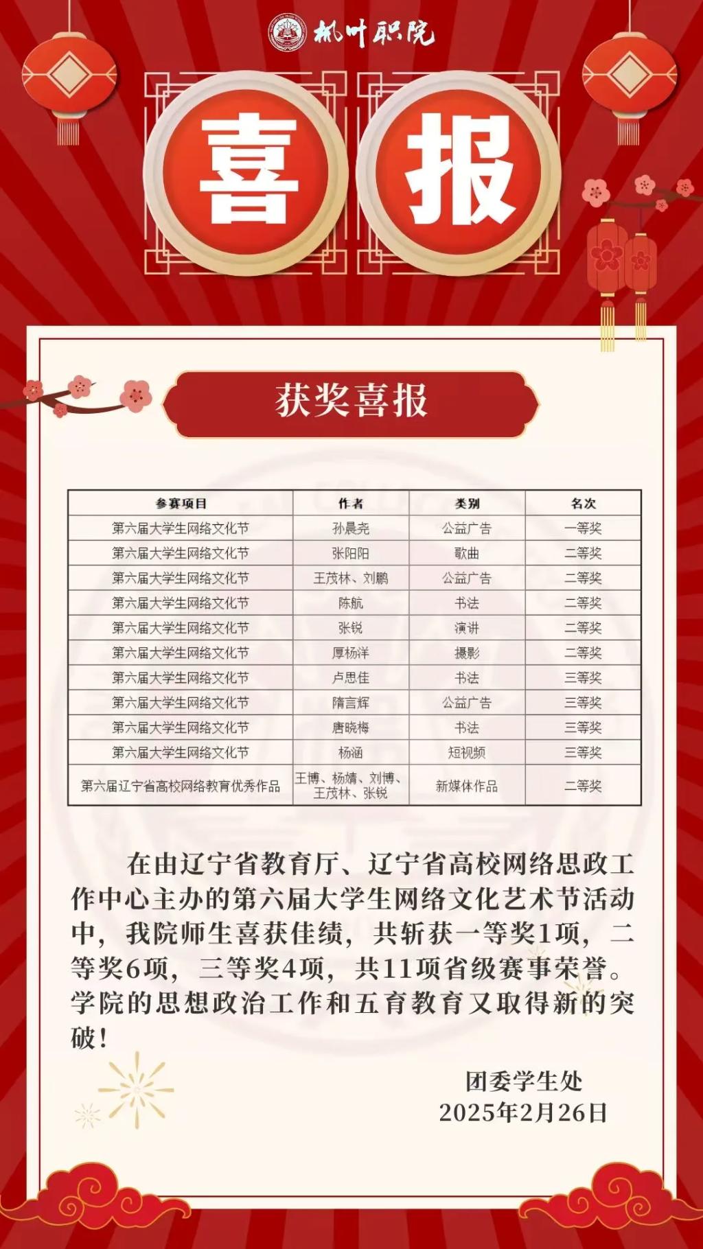 在由辽宁省教育厅、辽宁省高校网络思政工作中心主办的第六届大学生网络文化艺术节活动中,我院师生喜获佳绩,共斩获一等奖1项,二等奖6项,三等奖4项,共11项省级赛事荣誉。学院的思想政治工作和五育教育又取得新的突破!