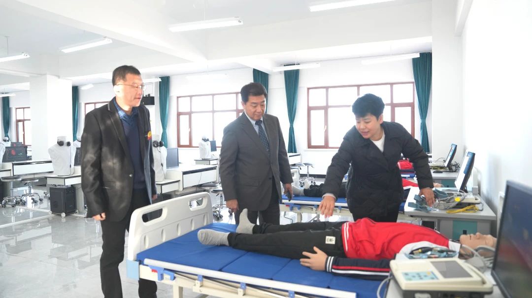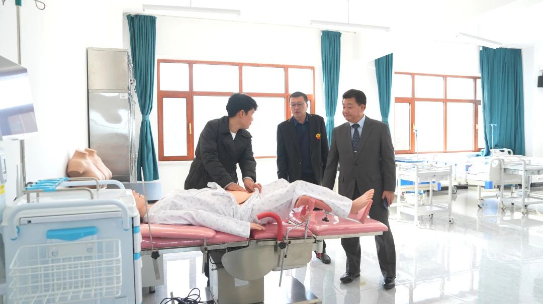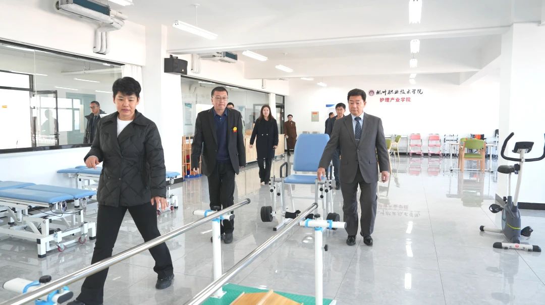 随后,考察团来到校医院与护理产业学院实训室。护理产业学院院长王珊带领考察团参观各实训区域,结合现场设备与教学场景进行详细讲解。