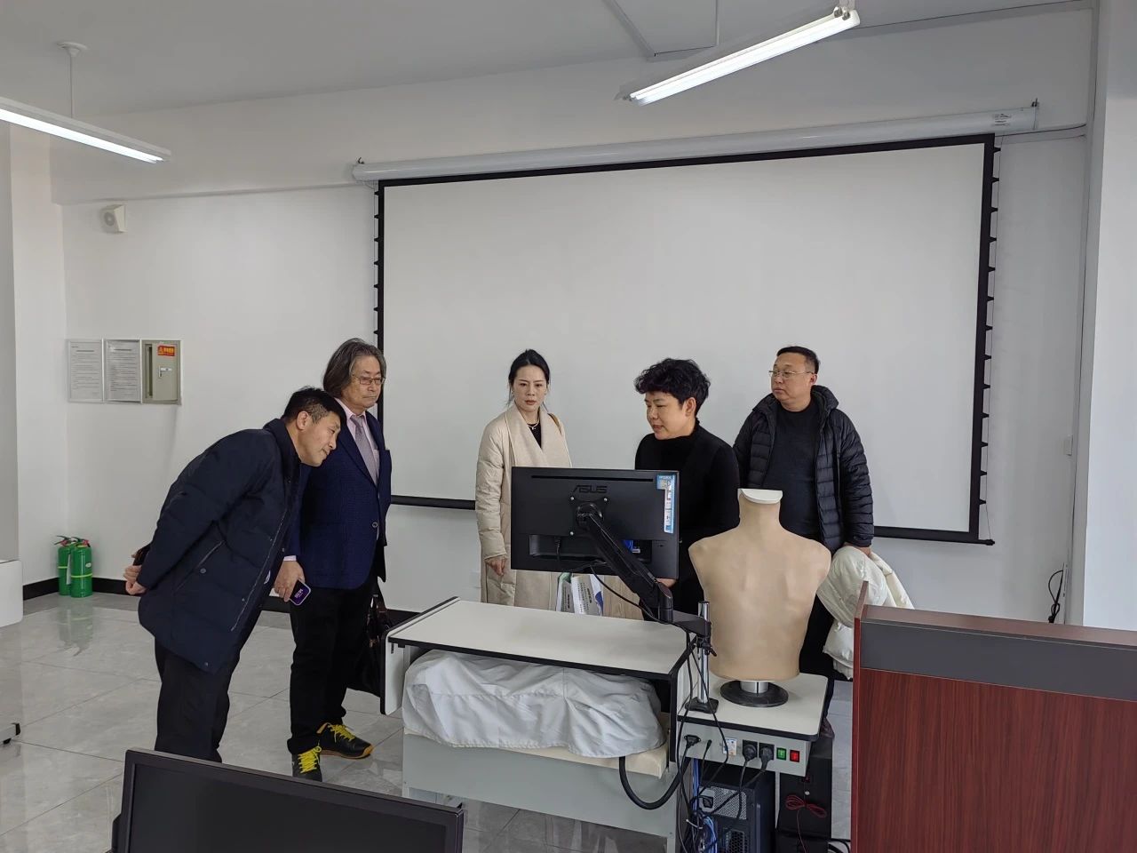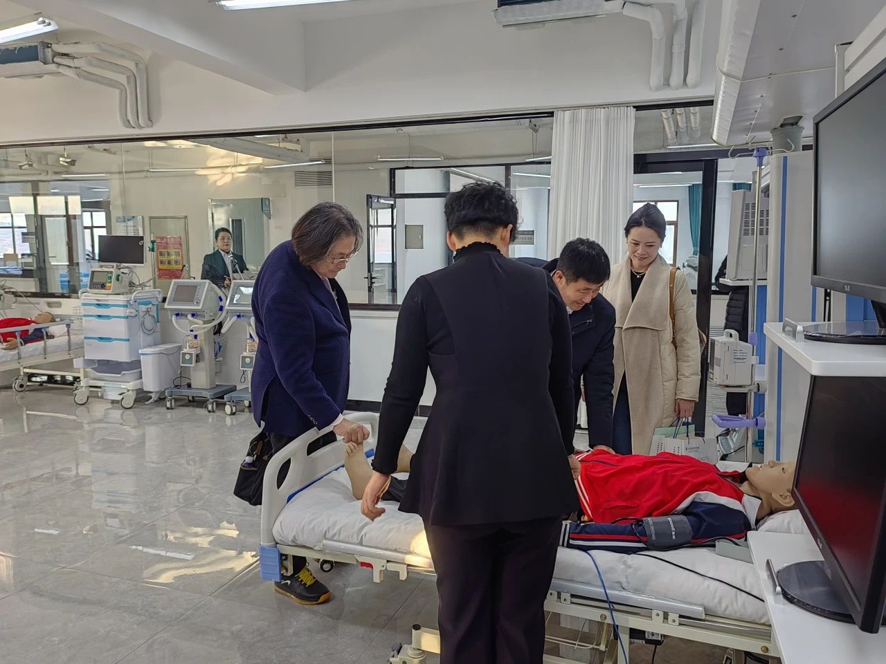 王忠泽院长与王珊院长首先陪同吉井胜行先生参观了我院大黑石校区护理产业学院实训室。王珊院长详细介绍了各专业实训室的设备配置及投入使用情况。护理产业学院教学楼作为集护理教学与临床一体化的实训培训基地,曾在2024年辽宁省第二届职业技能大赛中,为“养老护理员、健康照护、健康和社会照护、母婴护理员”等项目提供了有力的实施保障。日方对我院在护理技能培养方面的大力投入与支持给予了高度肯定。