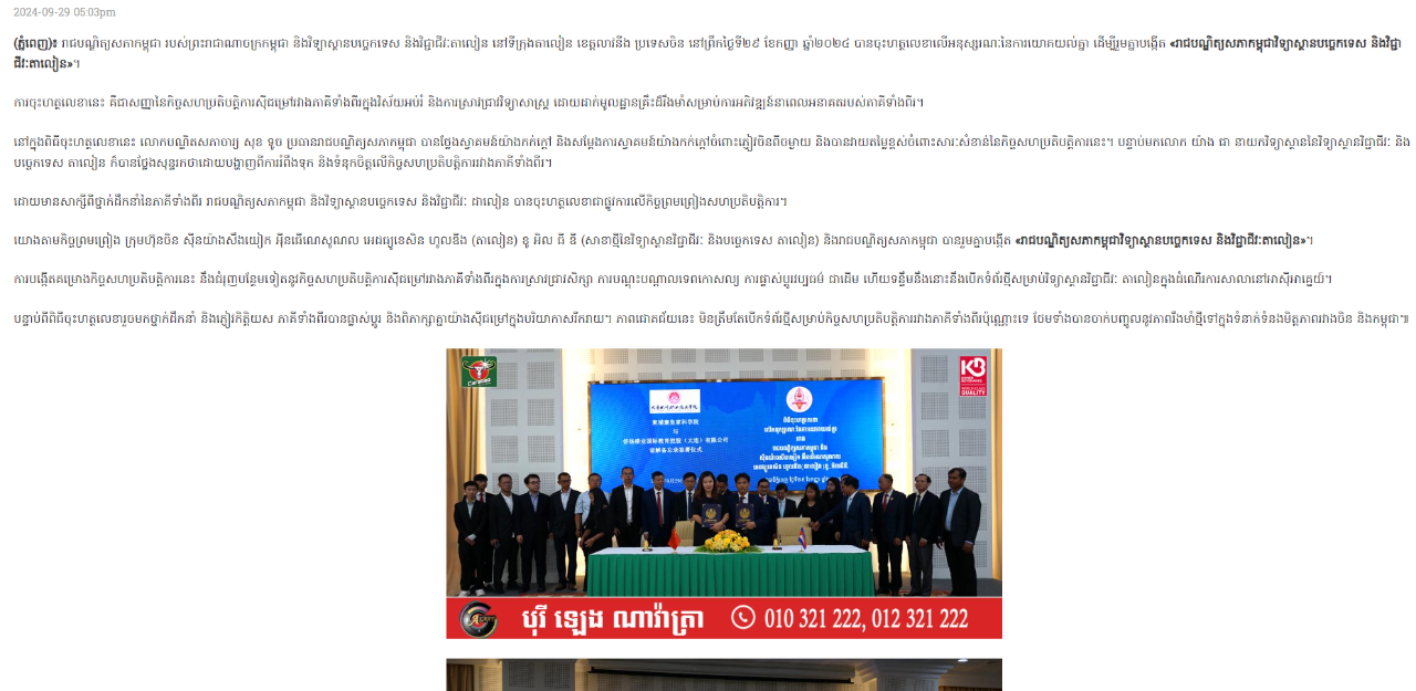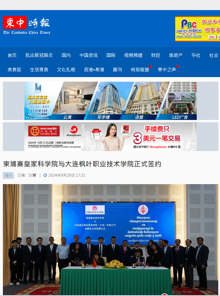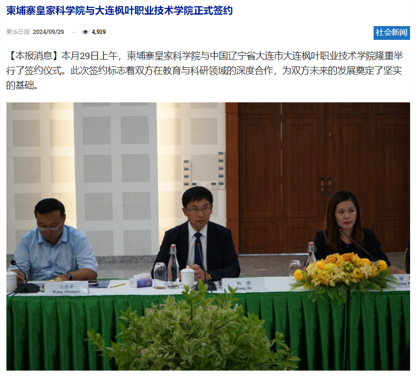 2024年9月29日,一场颇具意义的签约仪式在柬埔寨凯摩拉韦都楼洞里萨大厅隆重举行。大连枫叶职业技术学院与柬埔寨皇家科学院于此携手,共同开启了教育与科研合作的新纪元。这一里程碑式的合作,不仅标志着双方在教育与科研领域的深度融合,更为未来的共同发展铺设了坚实的基石,预示着一个全新时代的来临。