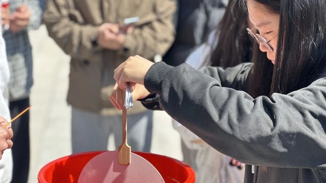 漆扇作为我国非物质文化遗产之一,承载着深厚的历史文化底蕴。4月2日,在图书馆前,“感受非遗魅力,传承华夏文脉”非遗漆扇体验活动如火如荼地进行着。活动吸引了众多学生和老师踊跃参与,现场气氛热烈非凡。大家参与漆扇和书签制作,沉浸式领略非遗技艺的独特魅力。老师们积极参与到活动组织和指导工作中,他们向学生们讲解非遗文化背后的历史渊源和文化价值,引导学生树立文化自信,传承华夏文脉。