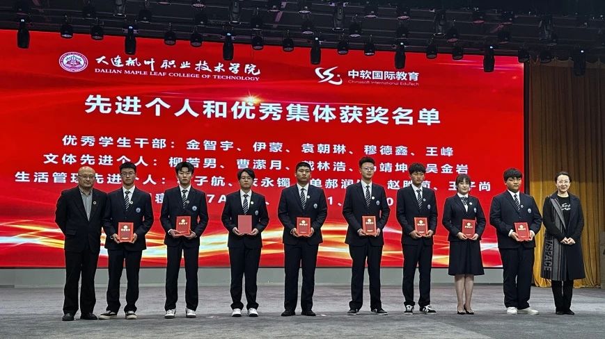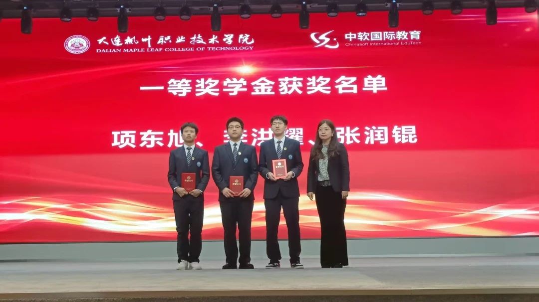讲座结束后,活动进入第二阶段——2024-2025学年第一学期奖学金及优秀学生干部、先进个人荣誉证书颁发仪式。智能互联网产业学院教学副院长阎树昕宣读了获奖名单,随后,中软国际教育科技集团高级副总裁李佳历、大连枫叶职业技术学院张冬冬副院长、高成林副院长、等领导分别为获得奖学金的同学以及先进个人和优秀学生干部颁奖。获奖同学们脸上洋溢着自豪的笑容,手捧荣誉证书,合影留念,记录下这难忘的瞬间。
