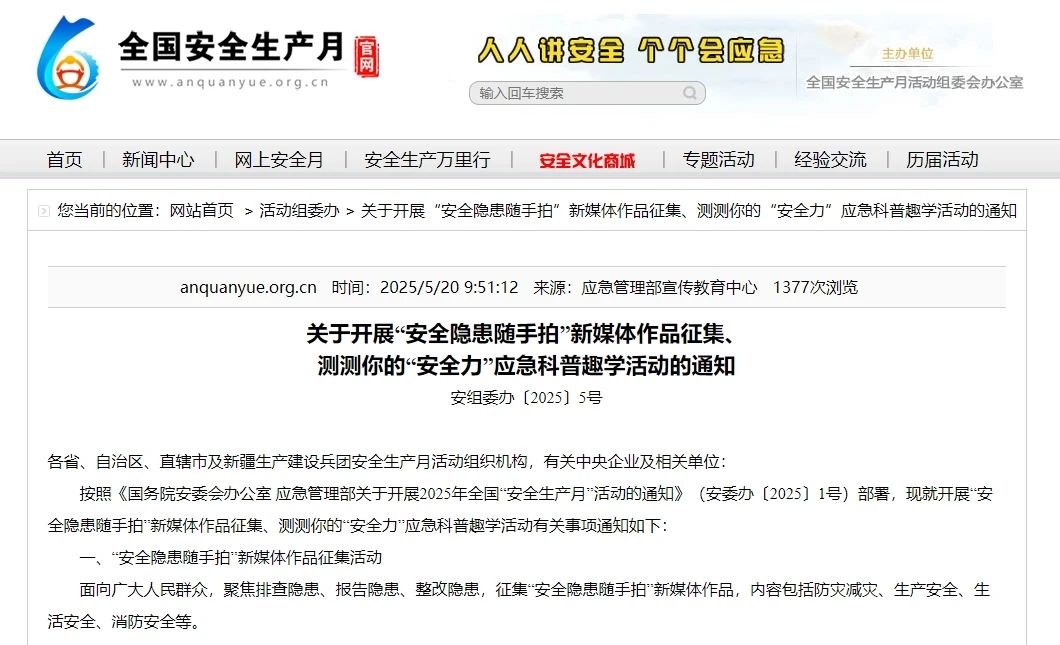 学院在《关于开展“安全隐患随手拍”新媒体作品征集、测测你的“安全力”应急科普趣学活动的通知》(安委办〔2025〕5号)中,被列为支持单位。这不仅是对我院工作的认可,更是激励我院持续发力,为构建安全防护体系贡献枫叶力量。