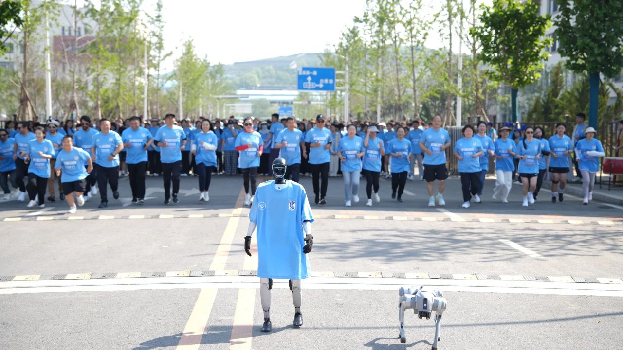 随着发令枪响,机器人、机器狗率先出发领跑,随后,学院董事长杨萍与学院党委书记、院长杨捷等领导共同领跑,带领参赛师生们踏上跑道。
