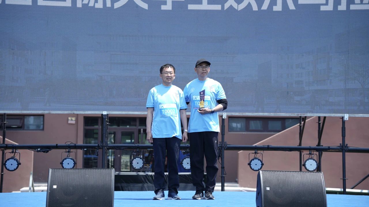 学院党委书记、院长杨捷为赛事独家赞助人颁发奖杯,感谢超凡教育创始人、大连超凡培训学校校长周顺成先生对本次活动的大力支持。周校长在致辞中用中英双语深情寄语:"愿大家在人生征途上始终欢乐奔跑,直至梦想抵达。"