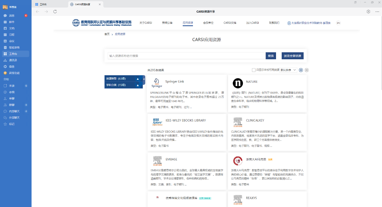 电脑上打开企业微信客户端,正常登录企业微信后在左侧工作台中找到CARSI资源共享,点击后即可跳转使用无需登录。