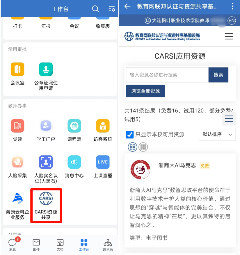 手机端打开企业微信,在工作台中找到CARSI资源共享,点击后即可跳转使用无需登录。