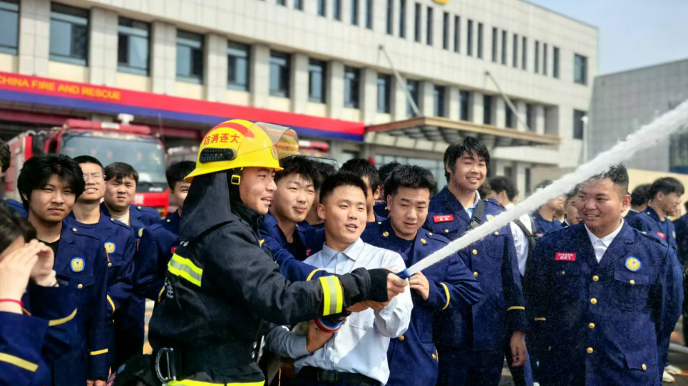 活动高潮阶段,在消防员的一对一指导下,围绕“双卷水带快速铺设”“接口密封检查”及“水枪射水角度控制”等核心技能展开专项训练。师生通过反复练习掌握了水带的连接技巧与水流控制方法。消防员结合实战经验,针对水带扭结、压力损耗等常见问题进行现场纠错,有效提升了师生的战术执行精准度与团队协作能力。