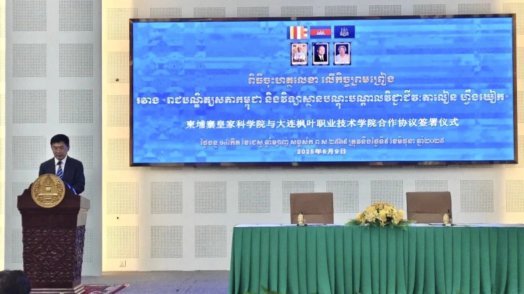 2025年6月9日,大连枫叶职业技术学院与柬埔寨皇家科学院合作协议签署仪式在柬埔寨皇家科学院高棉学者楼洞里萨湖厅隆重举行。