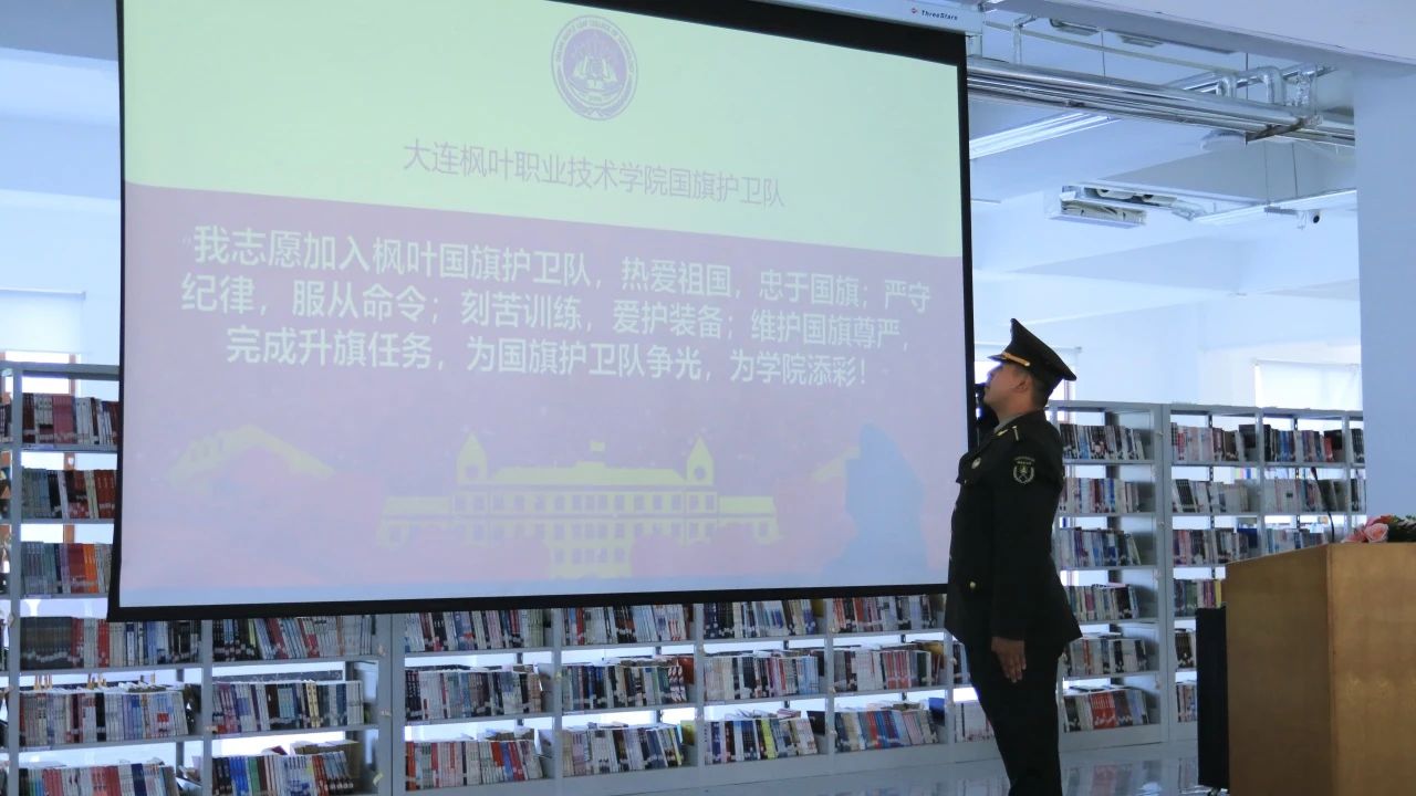 学生工作处处长王博宣读关于《成立大连枫叶职业技术学院国旗护卫队的决定》文件,详细阐明队伍组织架构、职责使命。随后,他向队长陈志鹏郑重授出队旗,鲜红的旗帜在会场中展开,标志着国旗护卫队正式肩负起守护国旗、传承爱国精神的使命。