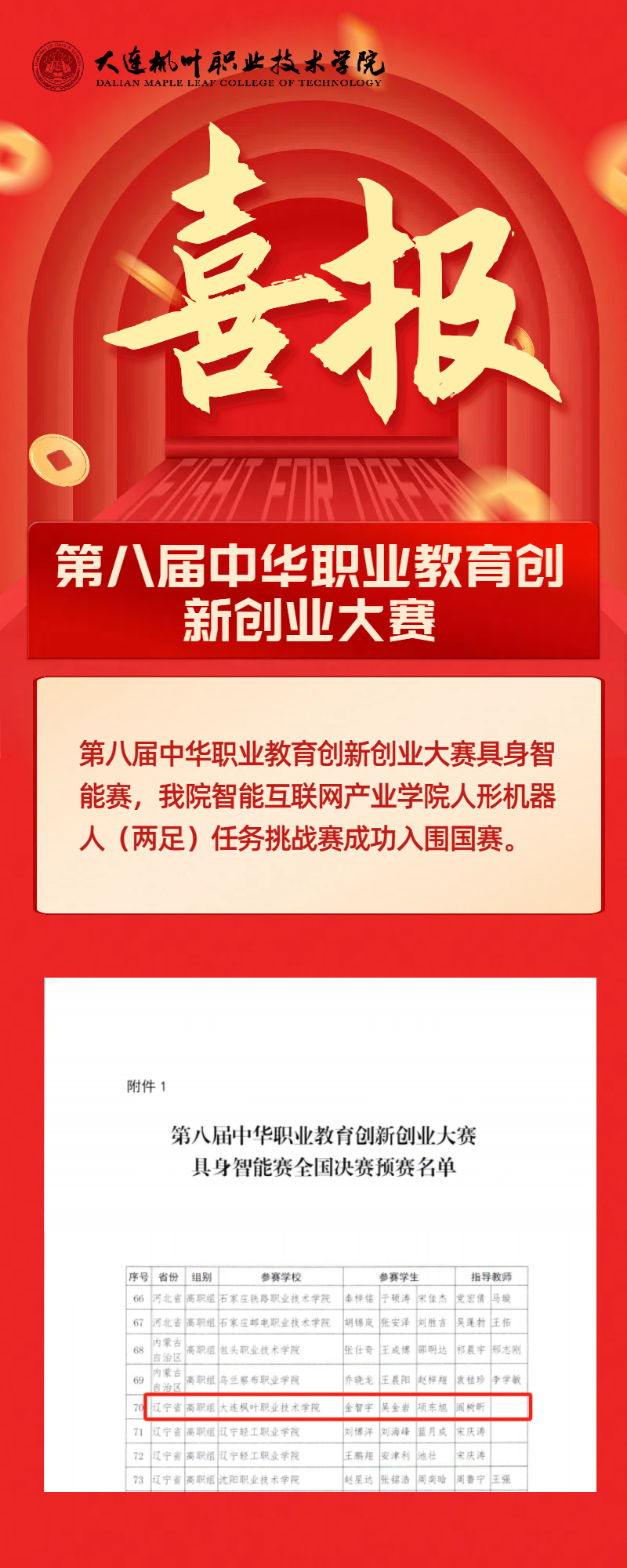近日,从中华职业教育社国赛预赛赛场传来捷报!枫叶职院在此次比赛中脱颖而出,首次进入中华职业教育创新创业大赛国赛预赛,实现了学院在该赛事上零的突破!这一成绩的取得,不仅是参赛师生拼搏奋进的成果,更是学院长期重视创新创业教育、深化产教融合的有力见证。