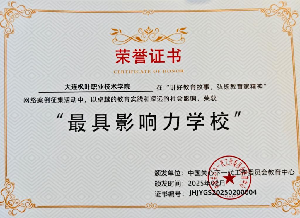 大连枫叶职业技术学院在“讲好教育故事,弘扬教育家精神”网络案例征集活动中,以卓越的教育实践和深远的社会影响,荣获“最具影响力学校”称号。这一荣誉不仅是对学院过往教育成果的高度肯定,更为学院未来发展注入了强劲动力。