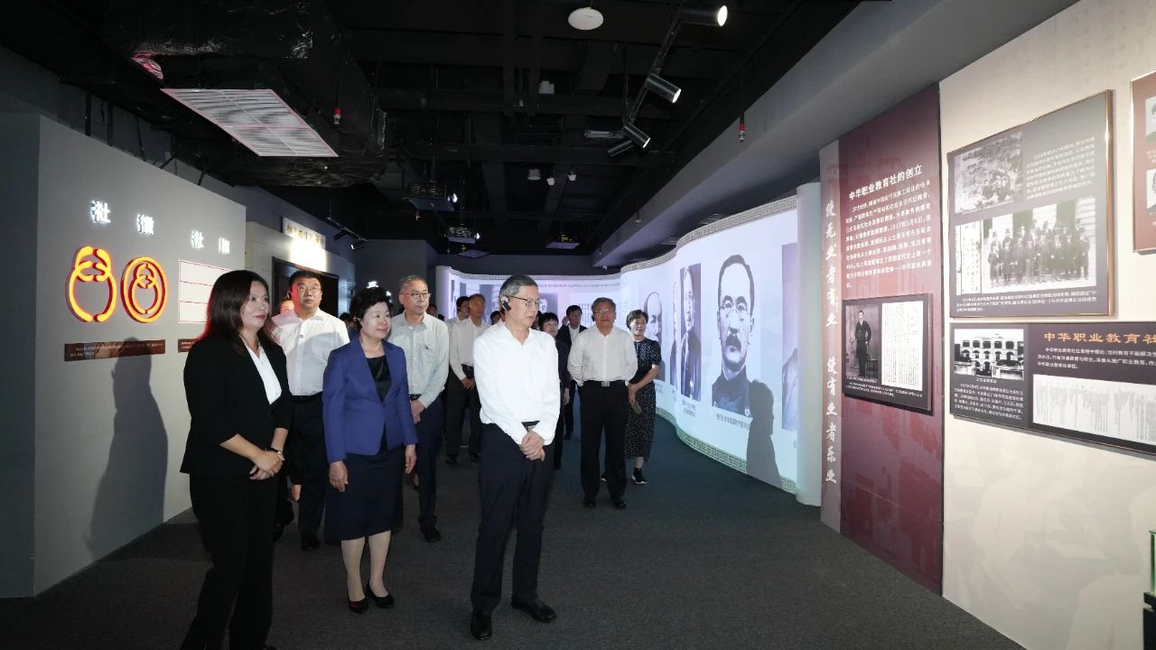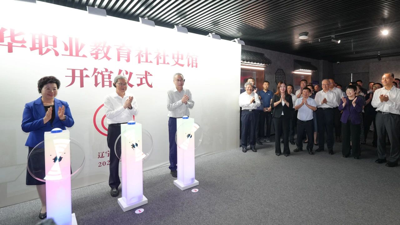 2025年7月4日,中华职业教育社社史馆在大连枫叶职业技术学院七顶山校区举行开馆仪式。全国人大常委会副委员长、中华职业教育社理事长郝明金,全国政协副主席、中华职业教育社副理事长秦博勇,中华职业教育社党组书记、总干事王晓光,党组成员、副总干事彭岭果,审计署副审计长、辽宁中华职业教育社主任郭彩云,大连市政协主席宫福清,大连市委常委、统战部部长徐广湘,大连市政协副主席、大连中华职业教育社主任陈国贵等领导出席活动,为这座融合AI技术与职教历史的文化展馆揭幕。
