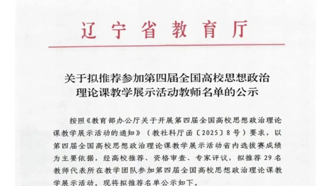 为深入学习贯彻习近平总书记对学校思政课建设作出的重要指示精神,推动思政课建设内涵式发展,2025年7月12日,第四届全国高校思想政治理论课教学展示活动辽宁省选拨赛在辽宁大学蒲河校区举行。7月16日,辽宁省教育厅对推荐参加第四届全国高校思想政治理论课教学展示活动名单进行公示,我院毛泽东思想和中国特色社会主义理论体系概论课程教学团队成功入选,也是辽宁省唯一入选此次全国高校思想政治理论课教学展示活动的民办院校教学团队。