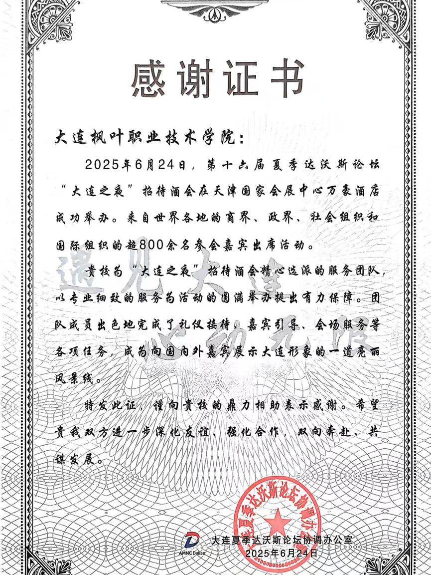 专业服务赋能盛会!大连枫叶职业技术学院获达沃斯论坛感谢信