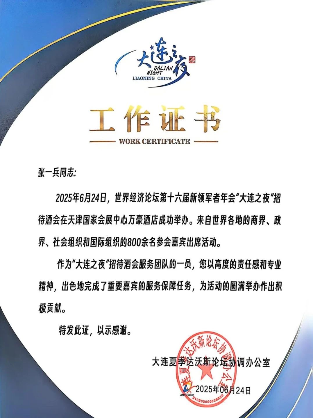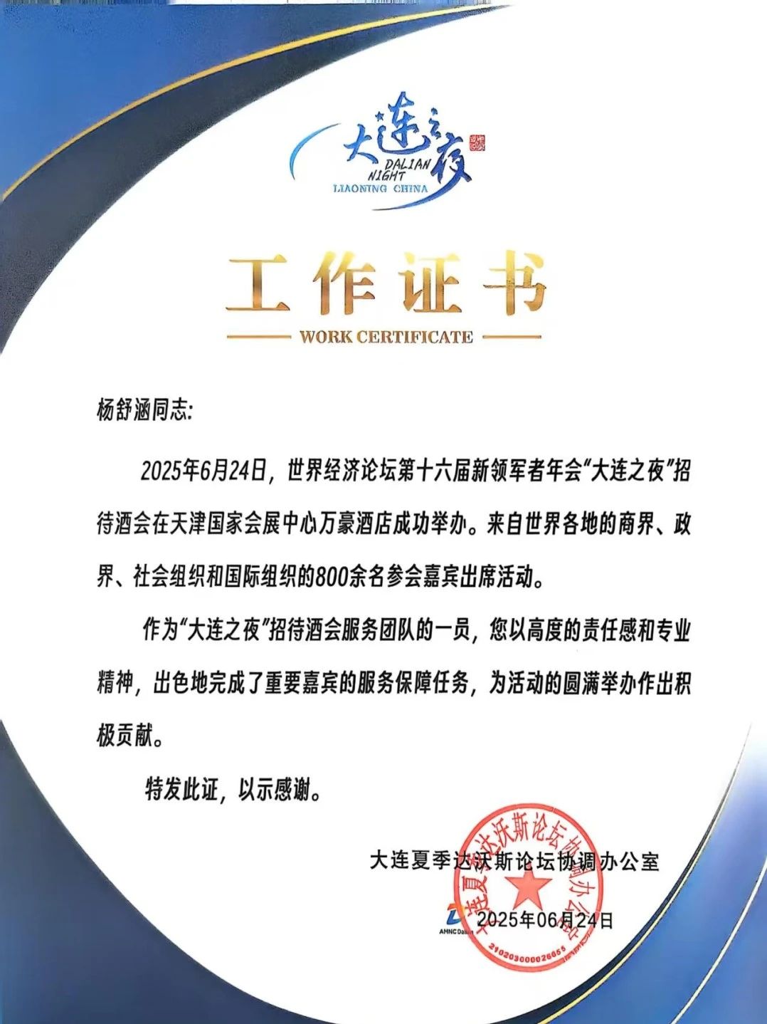 大连夏季达沃斯论坛协调办公室特别向学院发感谢证书,并为每一位同学颁发了个人工作证书,表彰他们“以高度的责任感和专业精神,为活动的圆满举办作出积极贡献”。带队教师李慧欣表示:“这次经历不仅提升了学生的专业实践能力,更开阔了他们的国际视野,是课堂教学与实战锻炼相结合的生动体现。”