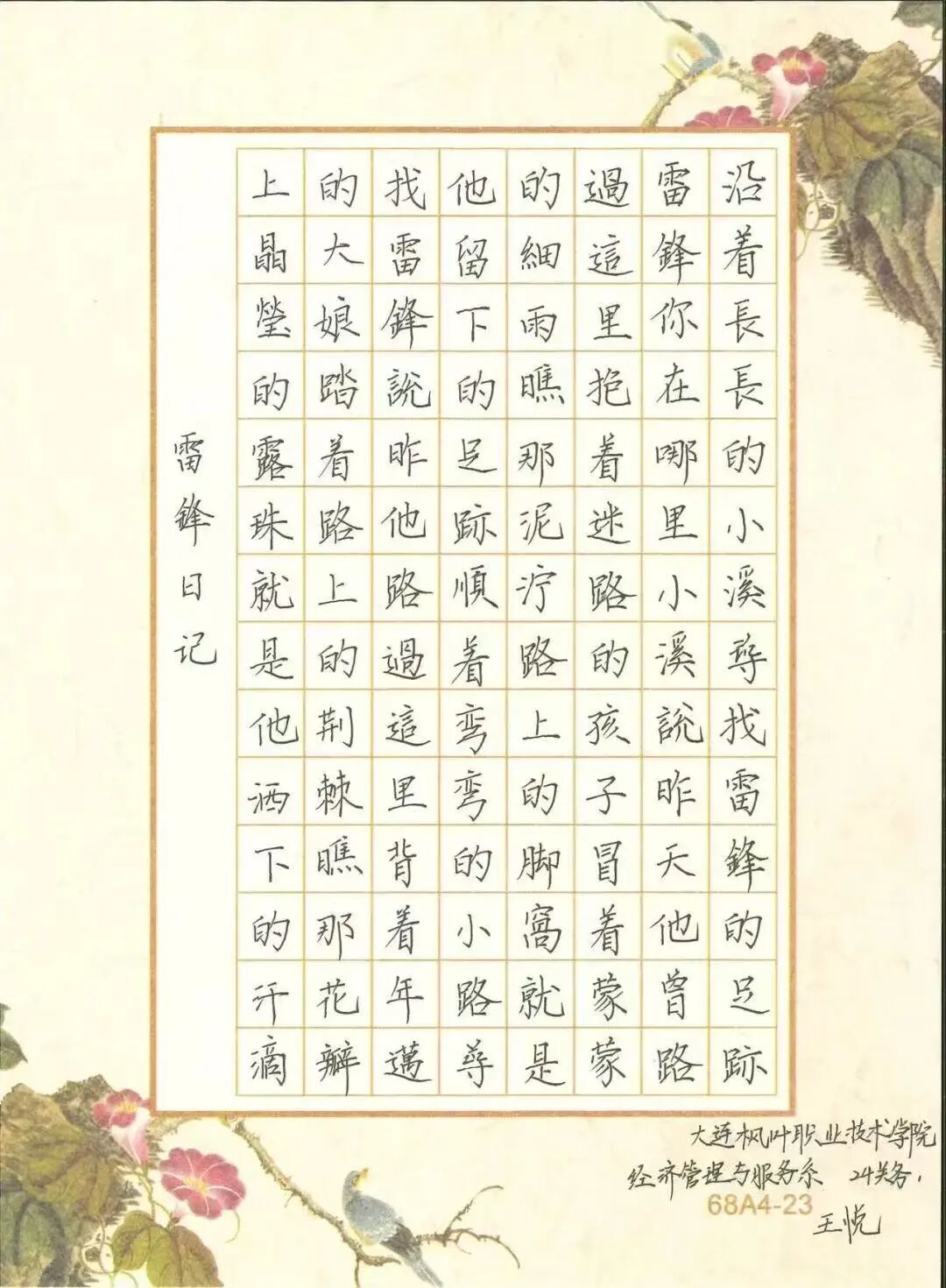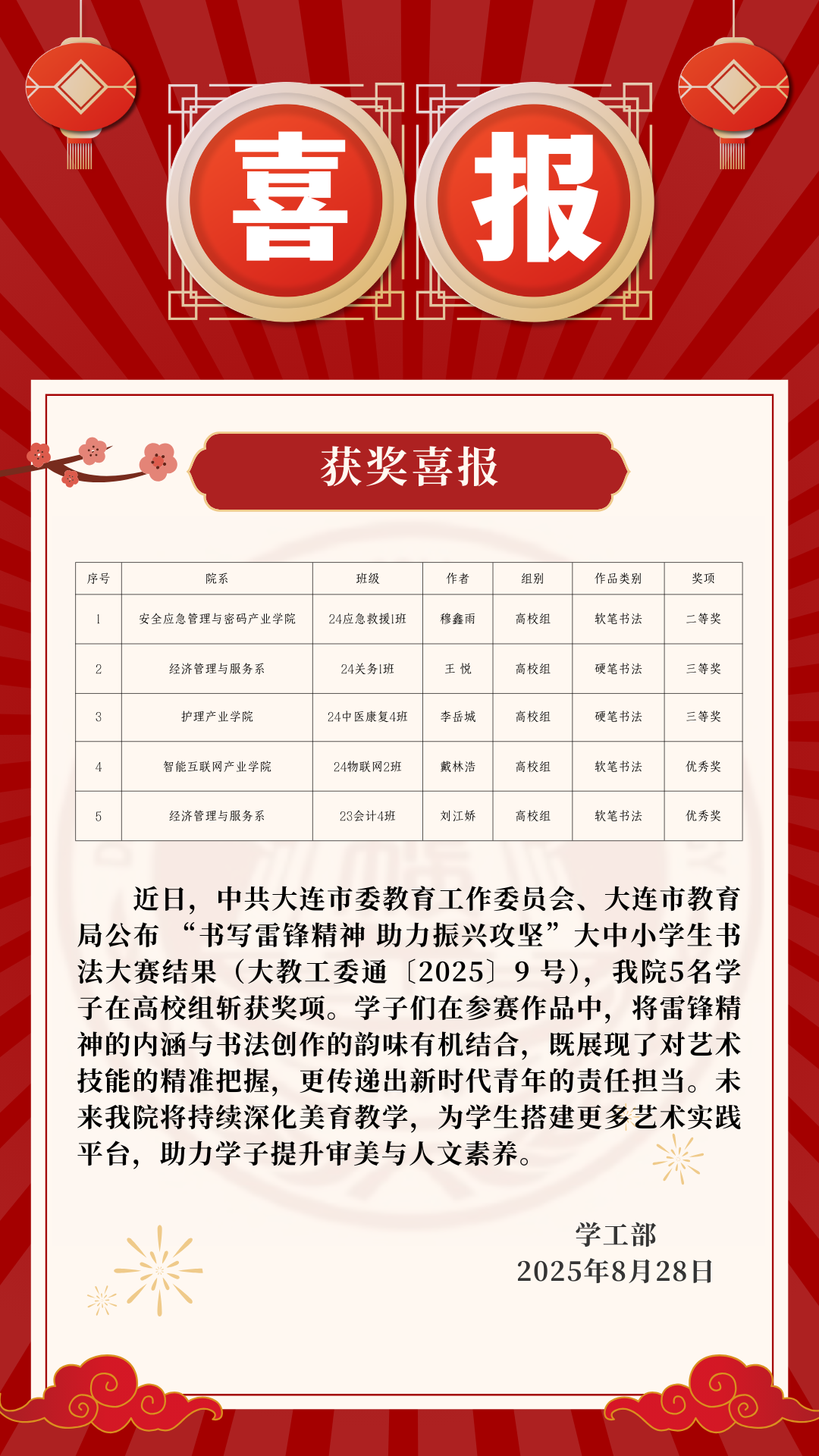 近日,中共大连市委教育工作委员会、大连市教育局公布 “书写雷锋精神 助力振兴攻坚”大中小学生书法大赛结果(大教工委通〔2025〕9号),我院5名学子在高校组斩获奖项。学子们在参赛作品中,将雷锋精神的内涵与书法创作的韵味有机结合,既展现了对艺术技能的精准把握,更传递出新时代青年的责任担当。未来我院将持续深化美育教学,为学生搭建更多艺术实践平台,助力学子提升审美与人文素养。