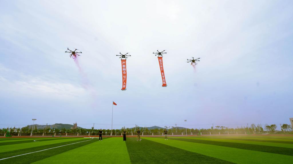 理论结合实践,梦想翱翔蓝天。由新聘教师带来长达20分钟的无人机飞行表演。多架无人机协同起舞:悬挂“产教融合引厂入校 低空经济逐梦启航”字样条幅的无人机稳稳定格空中,“8”字飞行流畅丝滑;垂直起降无人机拉出绚丽彩烟,划破长空;穿越机以上演特技动作,引来阵阵惊呼;航拍机全程直播,将盛况实时传递。双屏分别呈现地面站数据和活动直播画面,让与会嘉宾沉浸式体验了低空科技的无限魅力。
