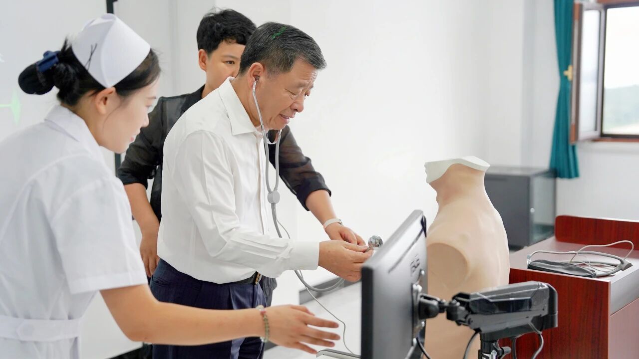 调研期间,王广发董事长一行首先来到我院护理产业学院实训中心。先后参观了模拟病房、仿真实训室等现代化教学设备,体验护理操作设备的使用,详细了解实训课程开展及产教融合情况,对我院现代化的实训条件和实践教学成果给予了高度评价。