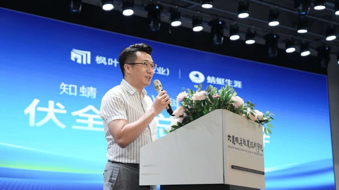 知蜻(大连)科技有限公司董事长伏全皓在发言中分享了知蜻科技在科技驱动生涯服务领域的实践经验,并宣读了关于成立“枫微蜓未来科技”的初心与愿景。他指出,未来,双方将协同教学优势、实训基地和互联网获客能力,推动微认证项目成为行业标杆,助力中国职业教育创新发展。