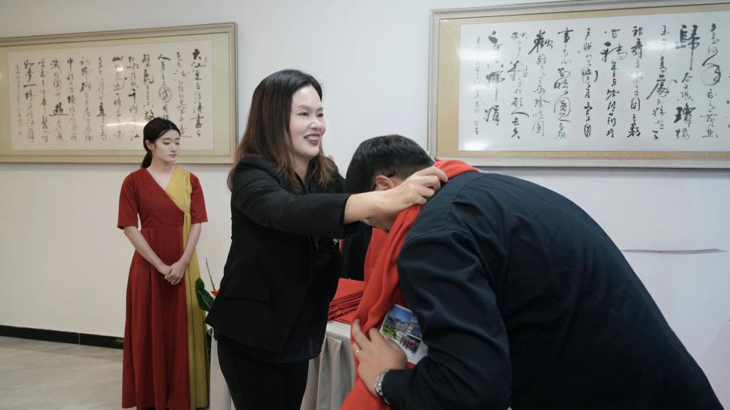 活动尚未正式开始,报告厅内已洋溢着温馨气息。现场循环播放的辅导员工作感悟直观展现了辅导员 “立德树人” 的日常实践。同时,入口处特设签名墙,尤为暖心的是,集团董事长杨萍亲临签到现场,亲手为每一位到场的辅导员佩戴象征 “温暖与敬意” 的红围巾。简单的举动让辅导员们在初冬时节感受到如春日般的温暖。