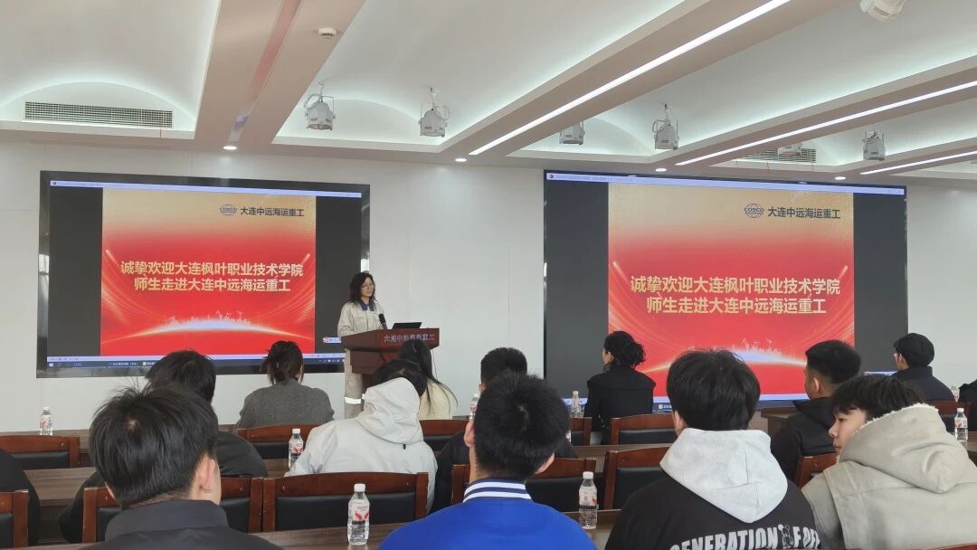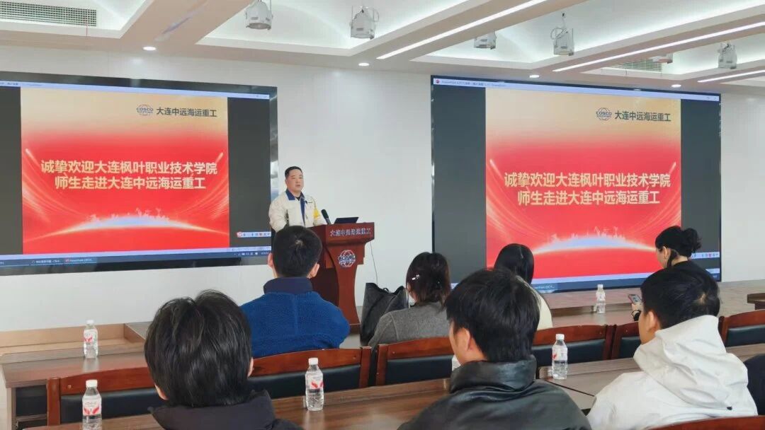 学院师生抵达厂区指定入口后,在中远人力资源部科员王启梅的引导下前往新经营楼会议中心5楼会议室集合。随后,王启梅介绍了本次研学的流程与目的,明确“观察、学习、交流 ”的核心方向;紧接着播放的企业宣传片,生动呈现了中远的发展历程、核心业务、企业文化及行业地位,让师生对企业有了直观认知。之后,人力资源部科员李明彦从多年经营积淀、厂区资源分布到人员架构,全方位解析企业运营逻辑,为师生搭建起“行业生态—企业创新—个人成长 ”的认知框架。