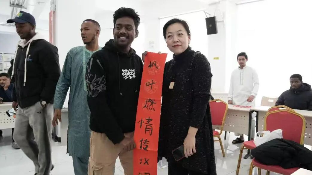 在老师的鼓励下,来华学子们纷纷拿起毛笔,尝试书写属于自己的第一幅对联。虽然笔触略显稚嫩,但每一笔都饱含着认真与好奇。有的学生专注地临摹字形,有的则向老师请教笔画顺序,现场充满了浓厚的中国文化学习氛围。当自己书写的对联完成时,留学生们小心翼翼地晾干,脸上满是自豪。