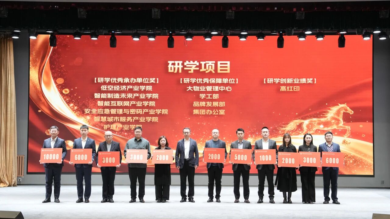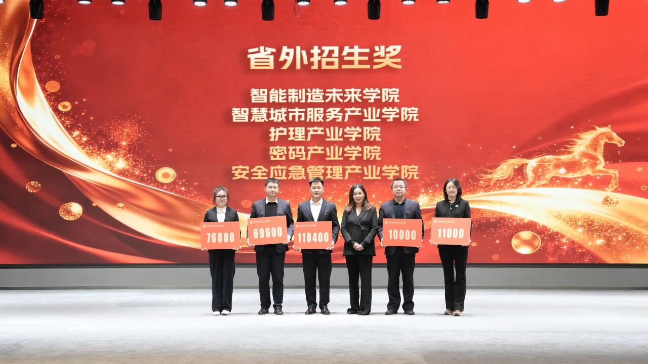 集团董事长杨萍为智能制造未来学院、智慧城市服务产业学院、护理产业学院、密码产业学院、安全应急管理产业学院颁发省外招生奖,并为班车司机师傅们颁发安全护航奖。