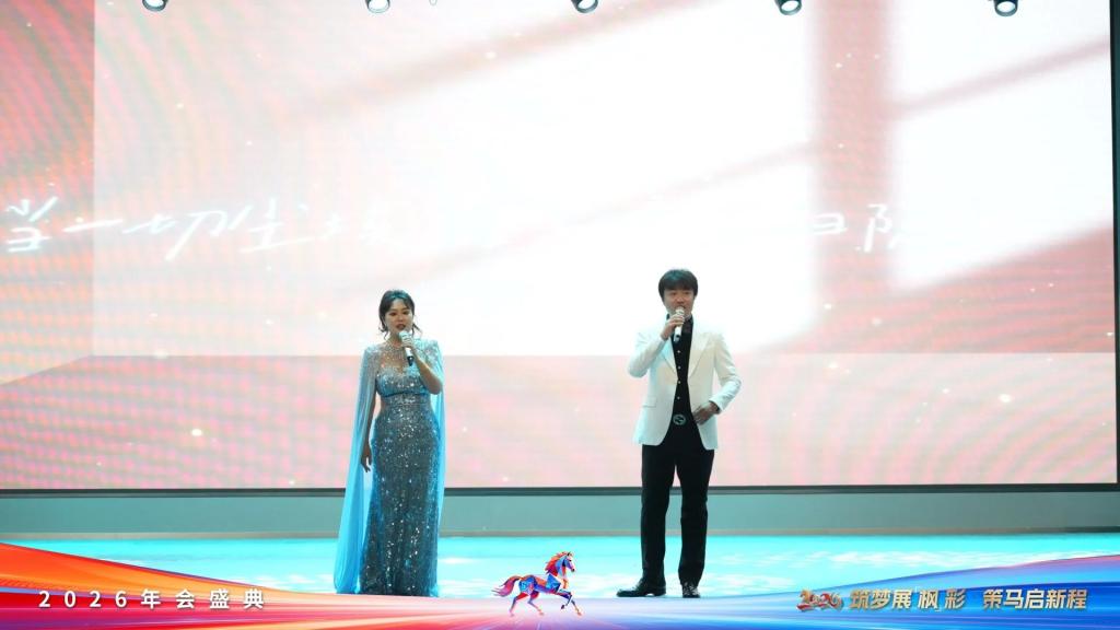 年会盛典在暖场视频的沉浸式氛围中拉开序幕,四位主持人登台亮相,致敬每一位辛勤付出的员工,瞬间点燃现场热烈氛围。