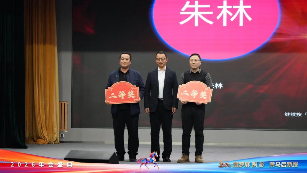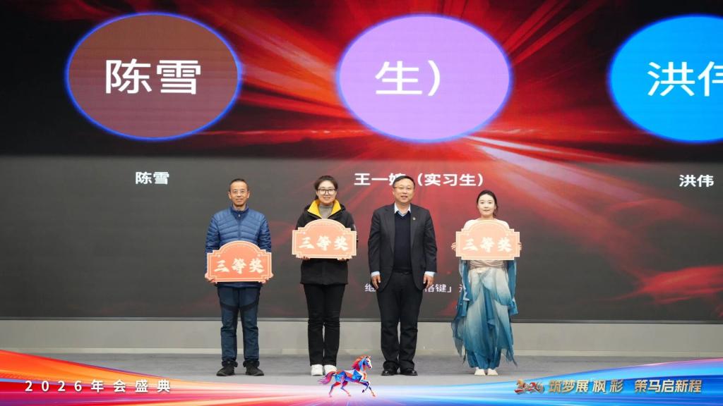 节目表演间隙,由AI助力的年会抽奖环节同步惊喜开启。三等奖3名获奖者由继续教育与国际合作交流学院王忠泽院长颁奖并合影留念;二等奖2名获奖者由集团总经理、学院副校长艾立斯颁奖并合影留念;一等奖揭晓后,由杨萍董事长为获奖者颁奖并合影留念。一份份精心准备的奖品,承载着学院对大家新一年的美好期许。