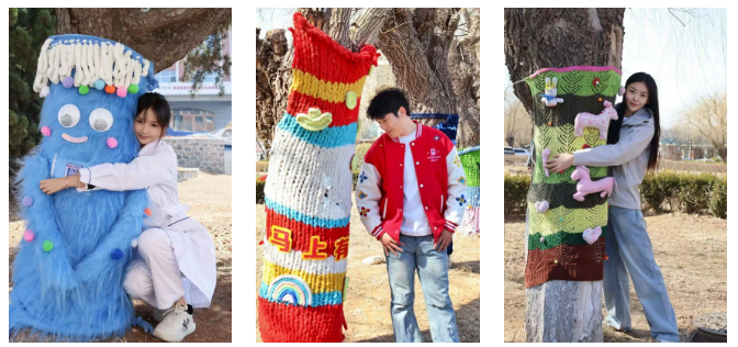 “大树穿衣”现场暖意融融,志愿者们三两一组、默契协作,指尖翻飞间,五彩斑斓的毛线缠绕在挺拔的树干上,原本单调的枝干披上了充满童趣与温情的“暖心花衣”。穿上“彩衣”的树木瞬间鲜活起来,化身校园里的“多巴胺打卡点”,路过的同学们纷纷驻足,与这些“暖心大树”合影留念,随手拍下美好瞬间分享至朋友圈,让志愿暖意通过屏幕传递开来。