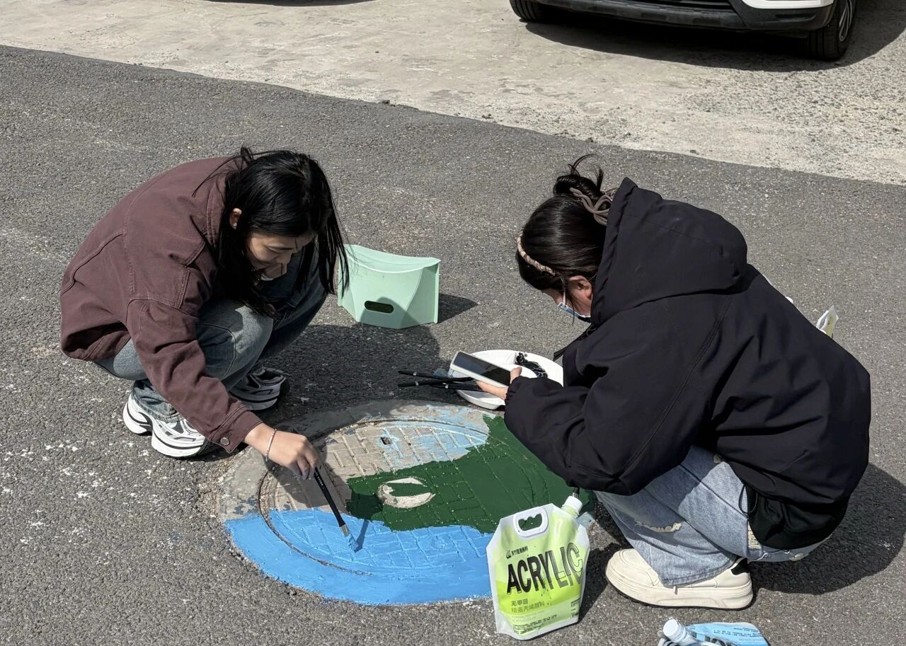 另一边的井盖彩绘现场更是创意迸发,成为校园里最吸睛的“网红打卡地”。志愿者们充分发挥想象力,在一个个不起眼的井盖上俯身执笔、勾勒线条、填充色彩,将春日的生机盎然都绘于方寸之间。经过数小时的精心创作,冰冷的井盖摇身一变,成为一幅幅色彩鲜艳的“地面艺术品”。