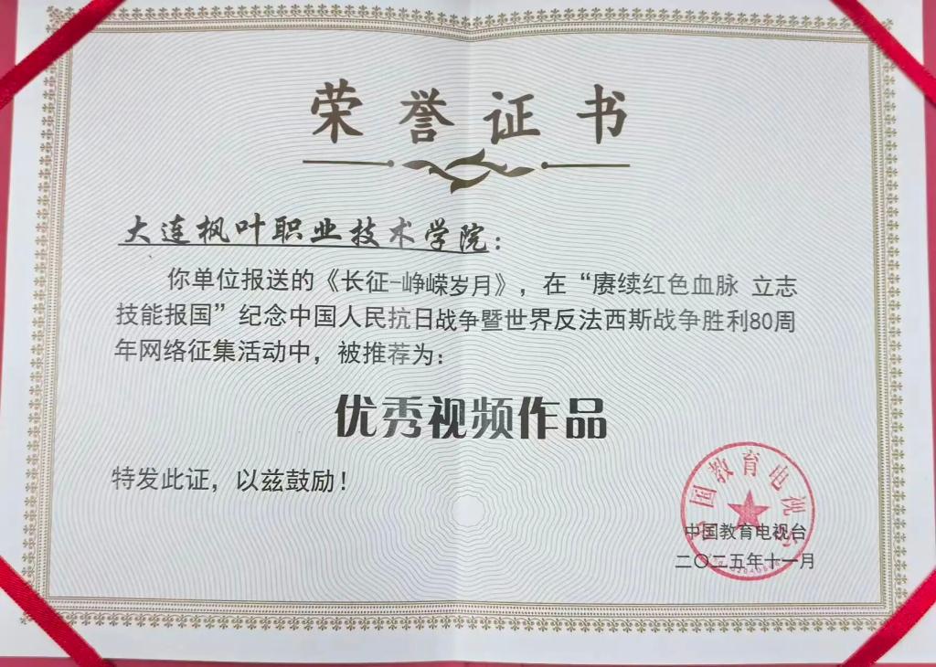 为深入贯彻全国教育大会精神,落实《教育强国建设规划纲要(2024—2035年)》和三年行动计划要求,实施新时代立德树人工程,根据《教育部办公厅关于开展2025年职业学校“技能成才 强国有我”系列育人活动的通知》部署,由中国教育电视台主办的“赓续红色血脉 立志技能报国”纪念中国人民抗日战争暨世界反法西斯战争胜利80周年网络征集活动圆满落幕,我院荣获本次活动“优秀组织单位”称号,报送的作品《长征—峥嵘岁月》被评为...