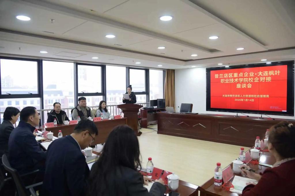 2026年1月14日,大连枫叶职业技术学院受普兰店区人力资源和社会保障局邀请,参加校企对接座谈会,搭建政校企精准对接平台,助力区域经济社会发展。普兰店区人力资源和社会保障局局长邹旭、人才服务中心主任葛庭清、就业创业部部长郭樯、人才高校部部长高世明,大连枫叶职业技术学院创新创业学院院长高红印、就业开发科科长宋丹以及大连美德乐工业自动化股份有限公司、大连章谷成型科技有限公司等6家企业代表参会。座谈会上,人...