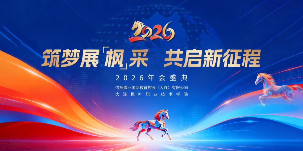 2026年1月8日,大连枫叶职业技术学院“筑梦展‘枫’彩,策马启新程”2026年年会在七顶山校区报告厅隆重启幕。集团董事长杨萍、学院党委书记魏晓峰、校长杨捷携领导班子与全体教职工欢聚一堂,回望奋斗征程,共绘未来蓝图,于欢声笑语中凝聚奋进合力。年会盛典在暖场视频的沉浸式氛围中拉开序幕,四位主持人登台亮相,致敬每一位辛勤付出的员工,瞬间点燃现场热烈氛围。首先,由基础教学部老师们带来开场舞《欢歌跃舞・枫耀北疆...