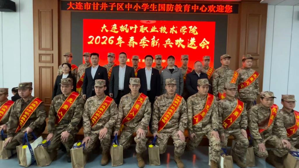 为深入贯彻国家征兵工作政策,弘扬爱国主义精神,切实做好新兵入伍保障工作,增强新兵的荣誉感、使命感与归属感,3月14日,大连枫叶职业技术学院2026年新兵欢送会在甘井子区国防教育基地隆重举行。学工部部长王博、七顶山校区学工部部长段正南、各学院学生管理副院长、全体入伍新兵和新兵家长齐聚现场,本次仪式由学工部主办,学工部干事张涛主持。▲2026年春季新兵欢送会领导及嘉宾出席现场▲学工部张涛老师主持2026年春季新兵...